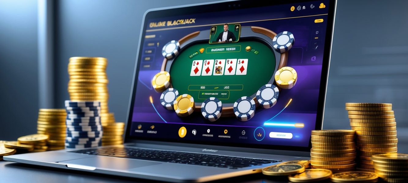 Seorang pemain sedang bermain blackjack online di komputer dengan tumpukan chip dan koin di sekitarnya, menunjukkan suasana permainan dan hadiah besar.