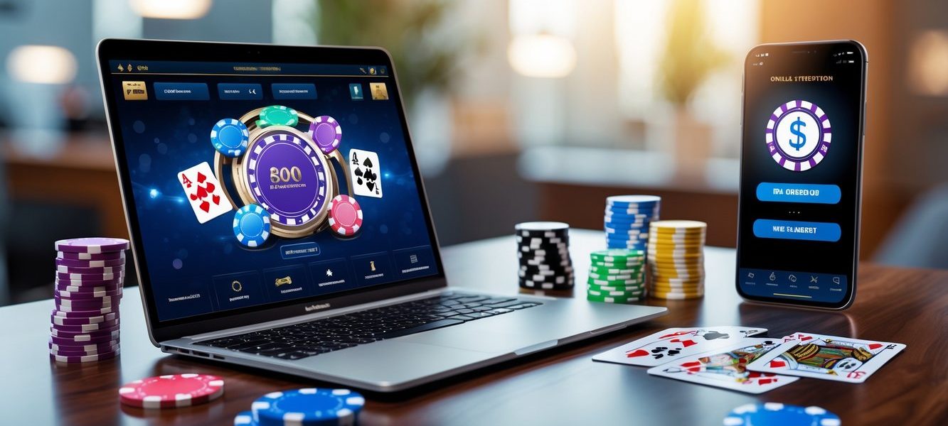 Seorang pemain poker online menggunakan laptop dan smartphone dengan chip poker dan kartu di atas meja kayu.