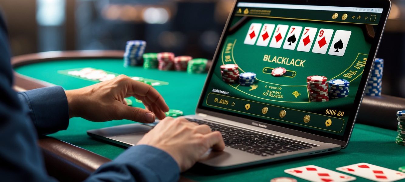 Seorang pemain menggunakan laptop untuk bermain blackjack online dengan tampilan meja hijau dan kartu di layar.